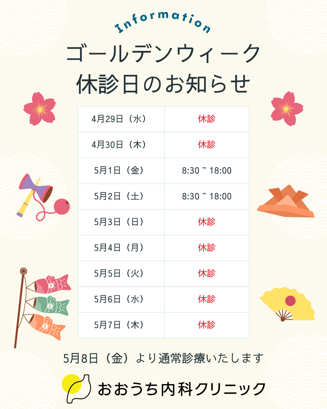 ホーム お知らせ ゴールデンウィーク休診日のお知らせ ゴールデンウィーク休診日のお知らせ 2026.04.28 お知らせ 2026年のGW期間の休診日のお知らせです お間違えのないようにご確認のほど、よろしくお願いいたします ご不明点などございましたらお気軽にお問い合わせください 一覧へ